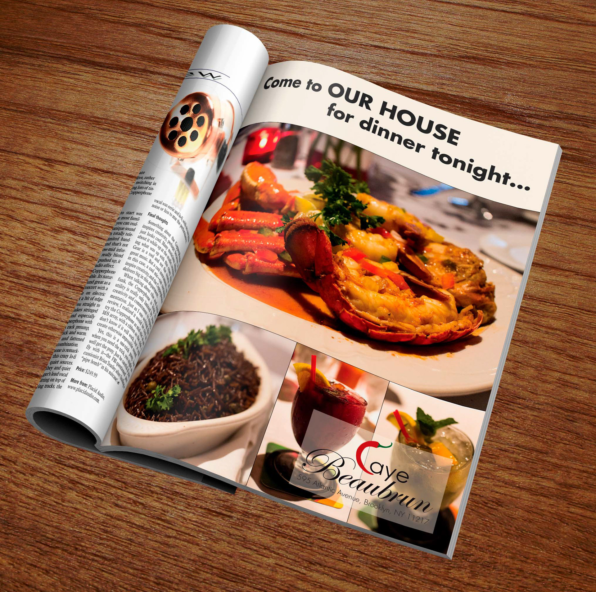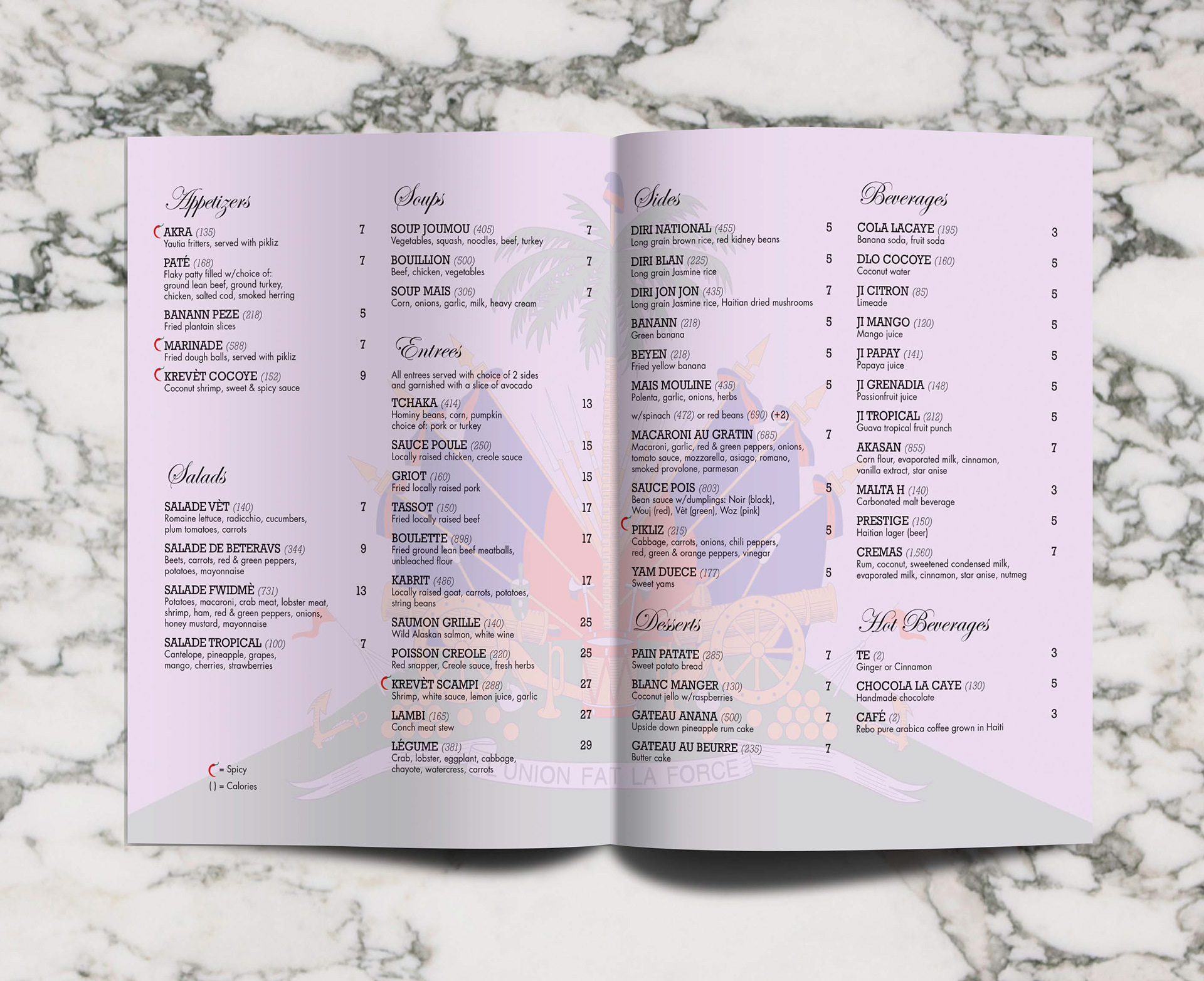 Client based project for a Haitian restaurant. Client provided the restaurant name, menu items and pricing and direction on the logo and menu.