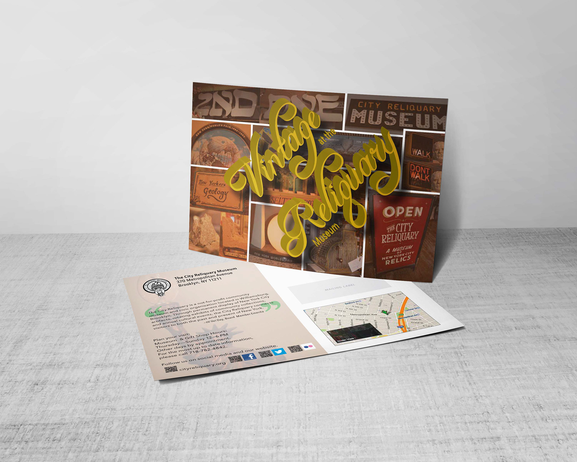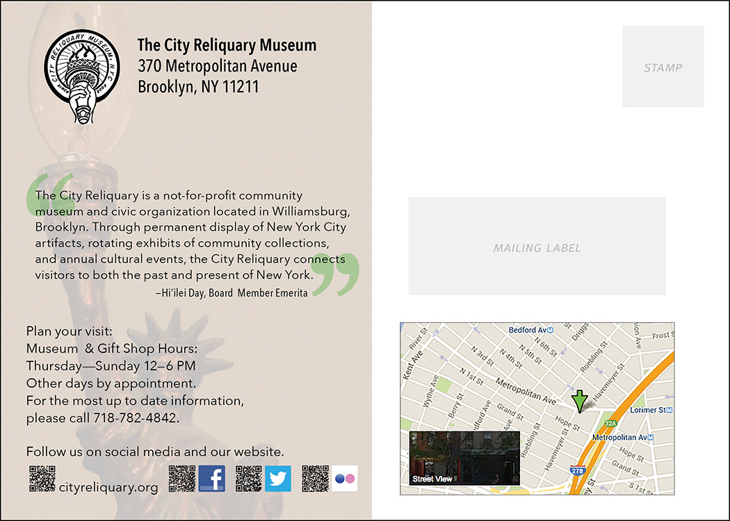 Postcard design for The City Reliquary Museum in New York City using my photography.