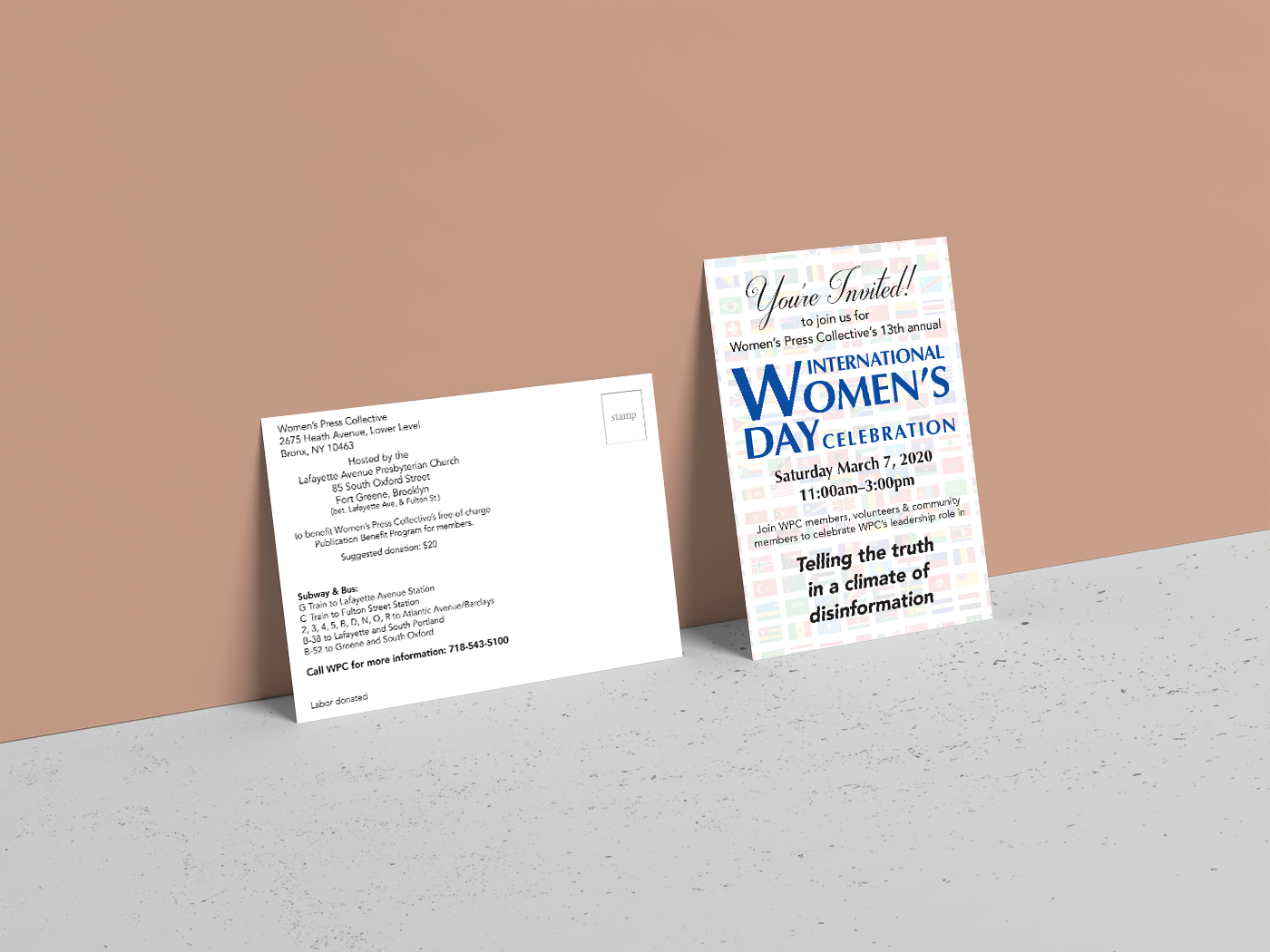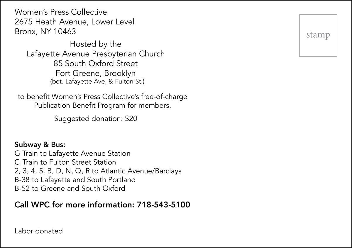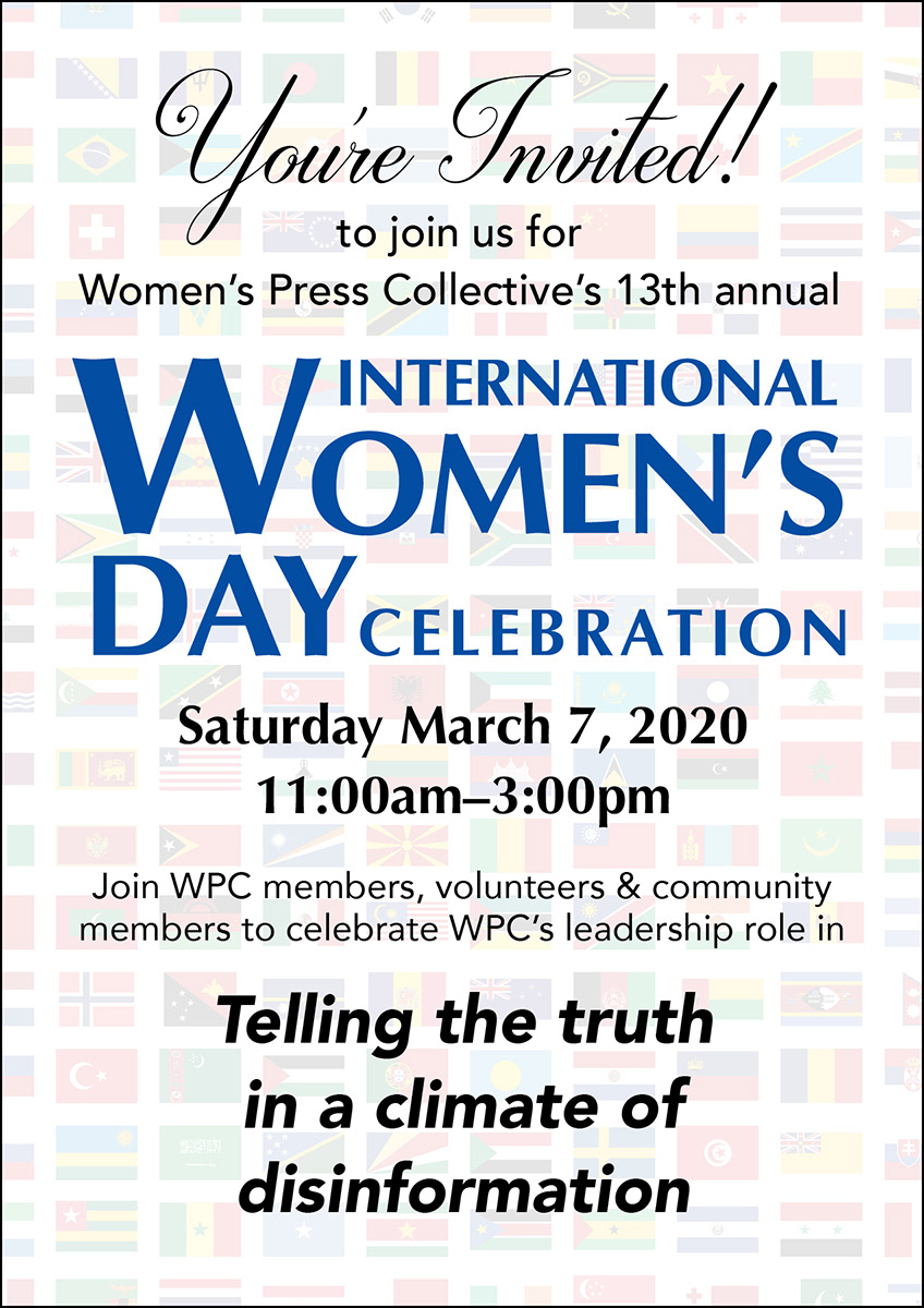 Advertising postcard for Women's Press Collective's International Women's Day Celebration.